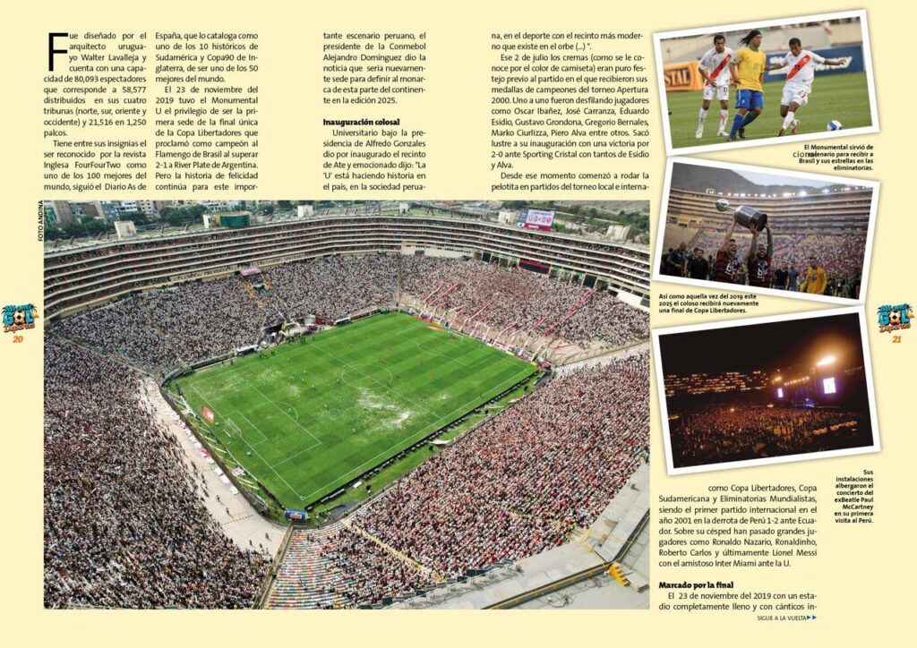 El 23 de noviembre del 2019 tuvo el Monumental U el privilegio de ser la primera sede de la final única de la Copa Libertadores que proclamó como campeón al Flamengo de Brasil al superar 2-1 a River Plate de Argentina. Pero la historia de felicidad continúa para este importante escenario peruano, el presidente de la Conmebol Alejandro Domínguez dio la noticia que sería nuevamente sede para definir al monarca de esta parte del continente en la edición 2025.