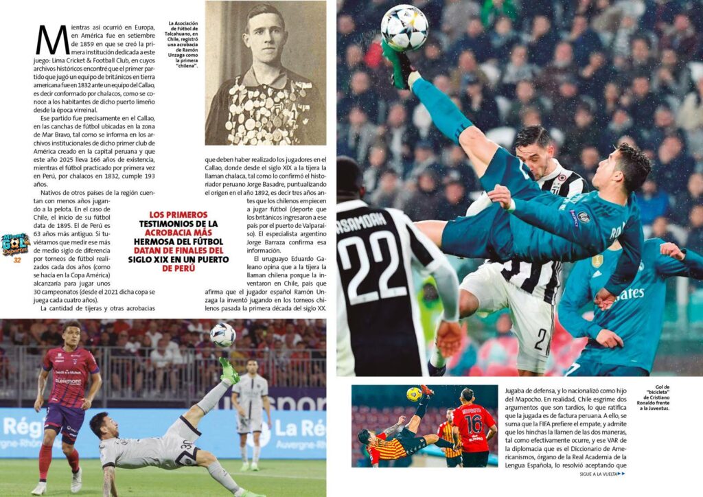 La cantidad de bicicletas y otras acrobacias que deben haber realizado los jugadores en el Callao, donde desde el siglo XIX a la bicicleta la llaman chalaca, tal como lo confirmó el historiador peruano Jorge Basadre, puntualizando el origen en el año 1892, es decir tres años antes que los chilenos empiecen a jugar fútbol (deporte que los británicos ingresaron a ese país por el puerto de Valparaíso). El especialista argentino Jorge Barraza confirma esa información. El uruguayo Eduardo Galeano opina que a la bicicleta la llaman chilena porque la inventaron en Chile, país que afirma que el jugador español Ramón Unzaga la inventó jugando en los torneos chilenos pasada la primera década del siglo XX. Jugaba de defensa, y lo nacionalizó como hijo del Mapocho.