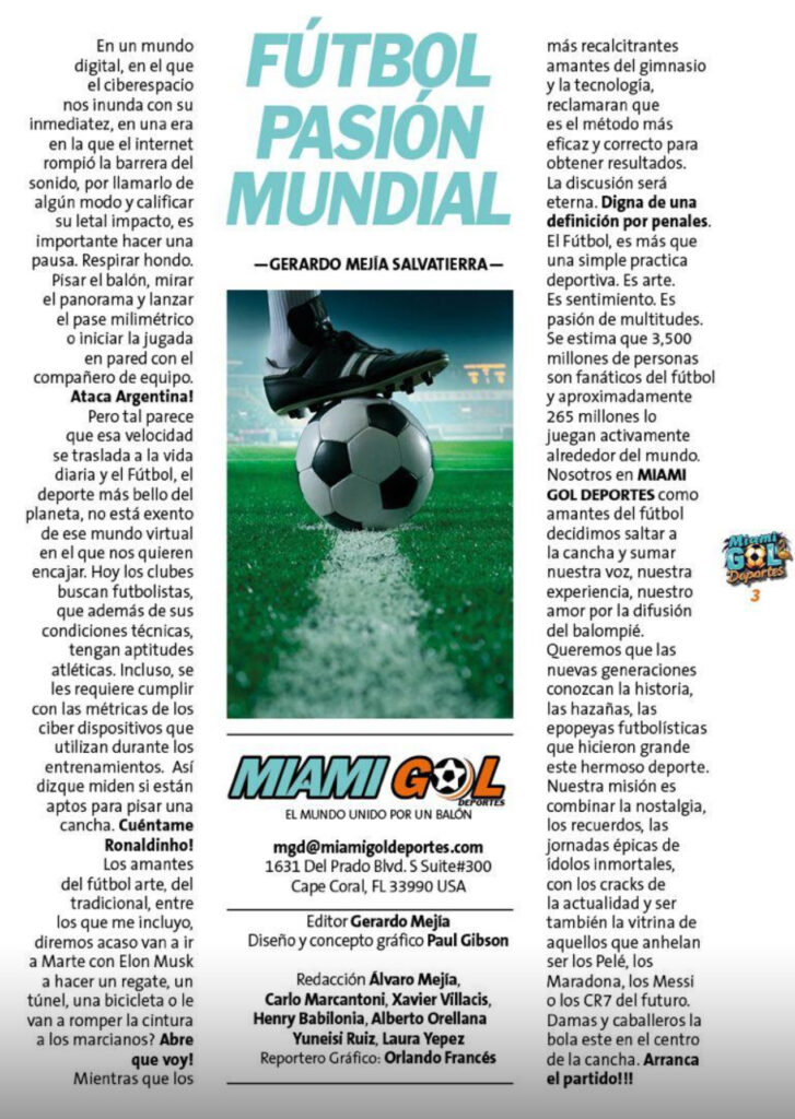 El Fútbol, es más que una simple practica deportiva. Es arte. Es sentimiento. Es pasión de multitudes. Se estima que 3,500 millones de personas son fanáticos del fútbol y aproximadamente 265 millones lo juegan activamente alrededor del mundo. Nosotros en MIAMI GOL DEPORTES como amantes del fútbol decidimos saltar a la cancha y sumar nuestra voz, nuestra experiencia, nuestro amor por la difusión del balompié.