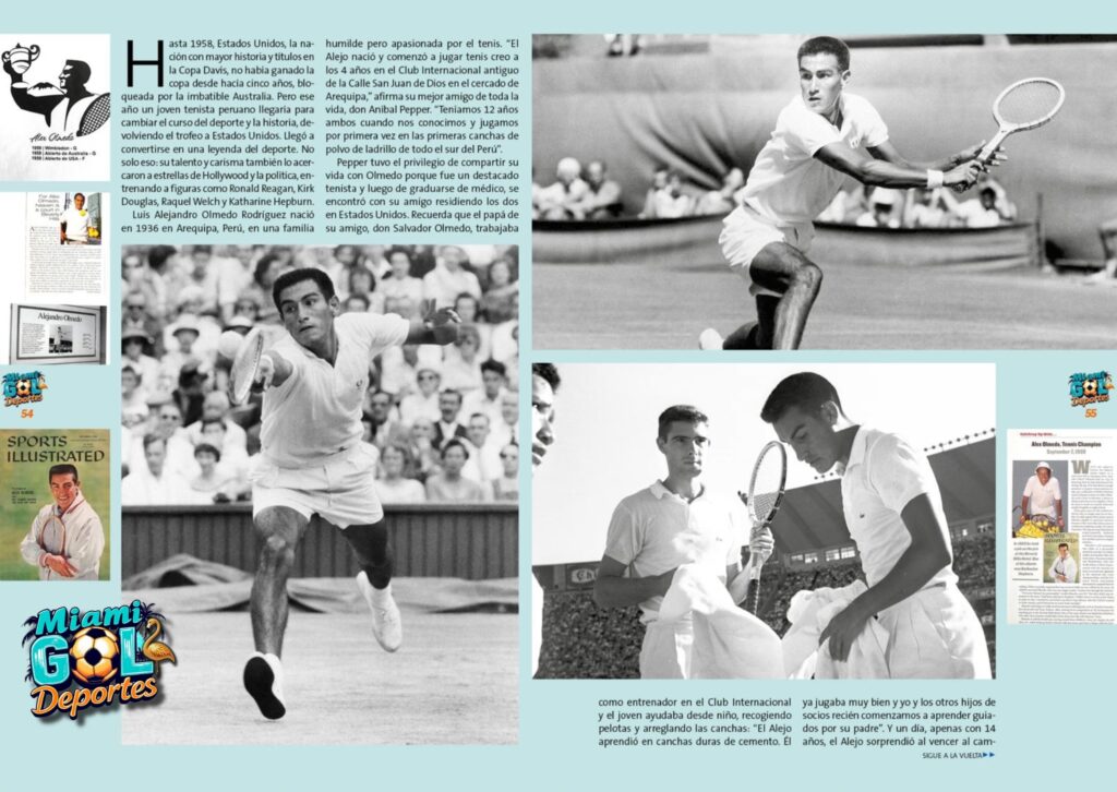 Pepper tuvo el privilegio de compartir su vida con Olmedo porque fue un destacado tenista y luego de graduarse de médico, se encontró con su amigo residiendo los dos en Estados Unidos. Recuerda que el papá de su amigo, don Salvador Olmedo, trabajaba como entrenador en el Club Internacional y el joven ayudaba desde niño, recogiendo pelotas y arreglando las canchas: “El Alejo aprendió en canchas duras de cemento. Él ya jugaba muy bien y yo y los otros hijos de socios recién comenzamos a aprender guiados por su padre”. Y un día, apenas con 14 años, el Alejo sorprendió al vencer al campeón local en un torneo abierto, un anuncio claro de su talento y determinación.